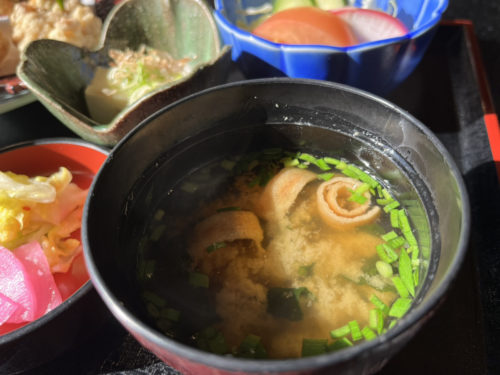 ホッと落ち着く味のお味噌汁。つやつやホカホカの白ご飯。新鮮な野菜たっぷりの小鉢も嬉しいですね。