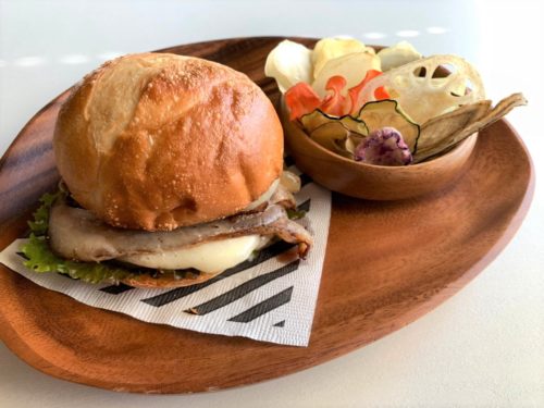 お肉をスライスし、燻製にするところからすべて自家製というベーコンバーガーもあり、ランチ利用も可能です。野菜チップスに使われている野菜は、すべて無農薬か減農薬のもので、6時間~半日かけて、店内で乾燥させて作るそうです。野菜や果物の切り方なども、季節や水分量によって違ってくるので、毎回厚みを変えてスライスされているのだとか。
