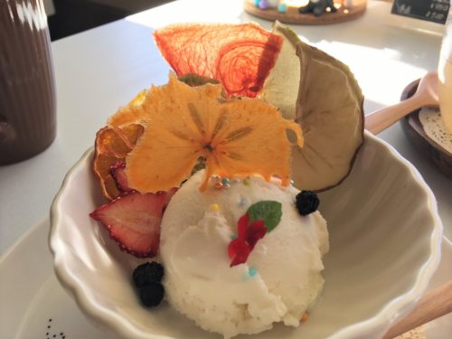 アイスにのっている柿のドライフルーツが、あか牛の形に切り抜かれていたりという阿蘇び心も!