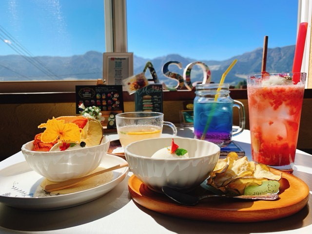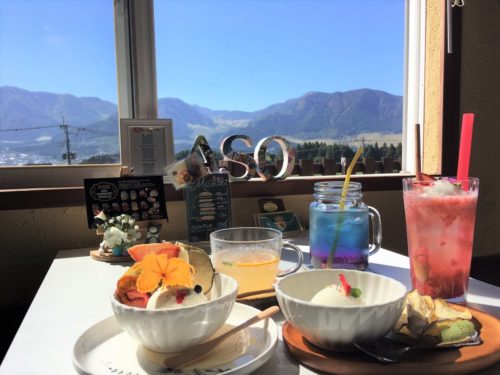 店名の通り、テラスから阿蘇外輪山が一望できる、素敵なロケーションのカフェです。