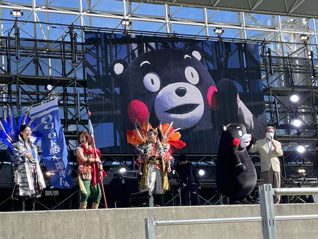 096k歌劇団の役者さんとくまモンと蒲島知事のコントで、和やかなムードが全体を包みます。くまモン関連商品の2020年売上高が1698億7877万円というのを、3回くらい連呼してました(笑)