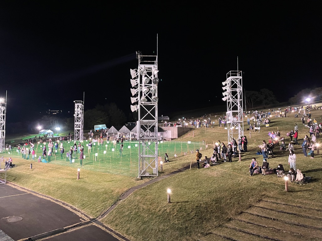 列ごとに網で仕切られていました。横の間隔は、黄色いリボンの前に立ってもらうことで距離を保つようになってます。お客さんひとりひとりが、絶対にこのフェスを成功させようという気持ちが、ひしひしと伝わってくるライブが次々と続きます。