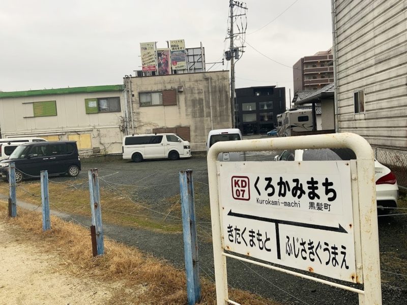 「気になる看板が見える」という話を聞いてやってきたのは熊本電鉄の黒髪町駅。周辺には高校が多いので高校生の利用が多い駅です。