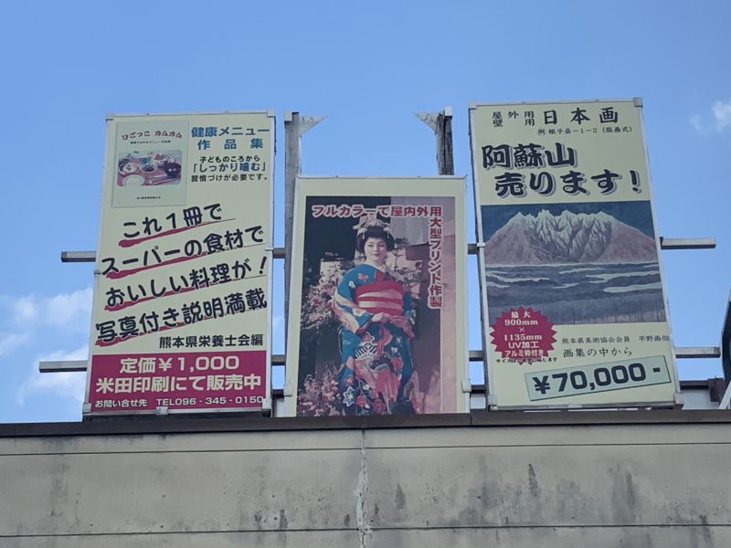 黒髪町駅のホームから気になる看板が見えるという話聞いて、現地に赴くと「阿蘇山売ります!」と書いてある看板がありました。よく見ると阿蘇山の絵画のパネルを販売しているようでしたが、なにやら歴史を感じる看板だったので、面白い気配を感じで設置者に話を聞きにいってみました!