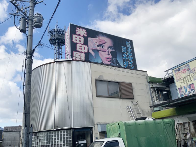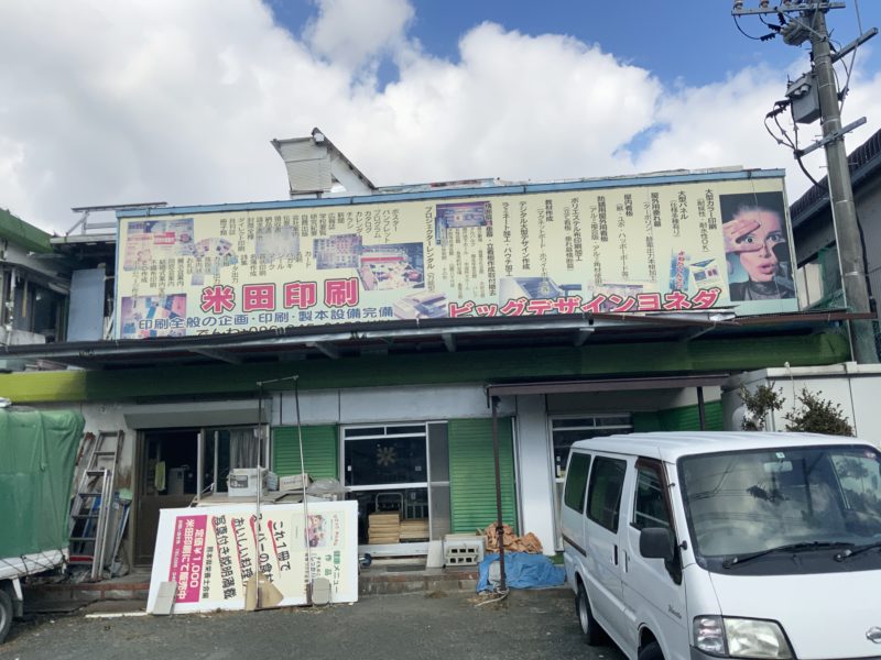 黒髪町駅からくるっと3号線側に回ったところにある「米田印刷」。こちらがあの「阿蘇山売ります」の看板を設置しているそうです。
