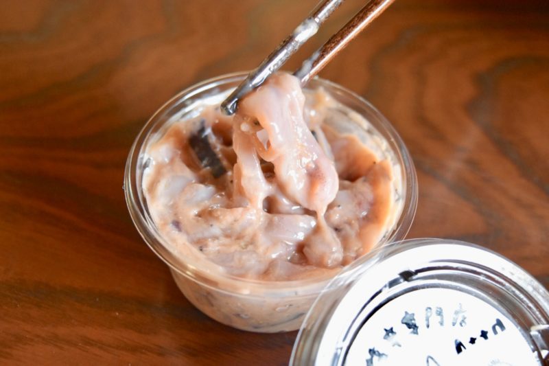 塩辛は3週間も熟成されているので、旨味をギュッと濃縮。北海道産イカと有明海産つけあみを使い、手作りの柚子胡椒が塩辛特有の臭みを抑えてくれます。お酒好きな人には、つまみにもご飯のお供にも良さそう。