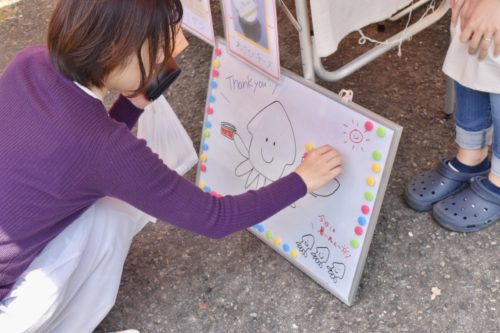 隣には、塩辛を買った個数分の磁石をお客さんに貼ってもらう奥さんお手製のボードがありました!イラストは毎回違うそうです。