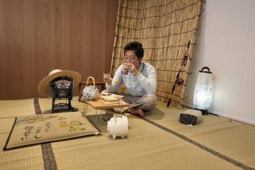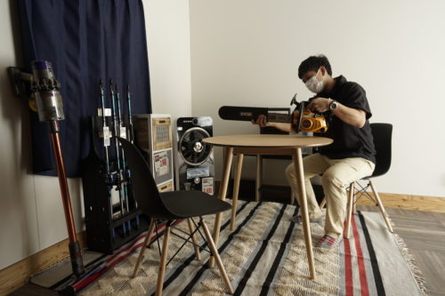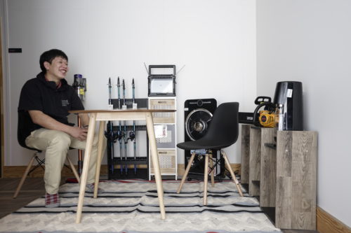 最新式のダイソン、そしてミストファン付きの扇風機に囲まれ、釣り道具やチェーンソーなど、ひたすら「好き」に囲まれた空間を演出。