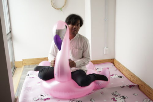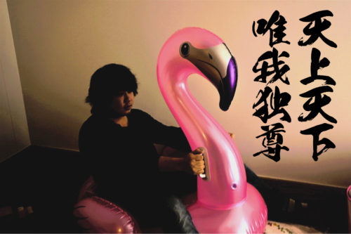 ちなみに、このフラミンゴ乗る人によって大きく表情を変えるんです。山田はこんなアレな感じでしたが、偶然通りかかったしゅんが乗るとこの通り。