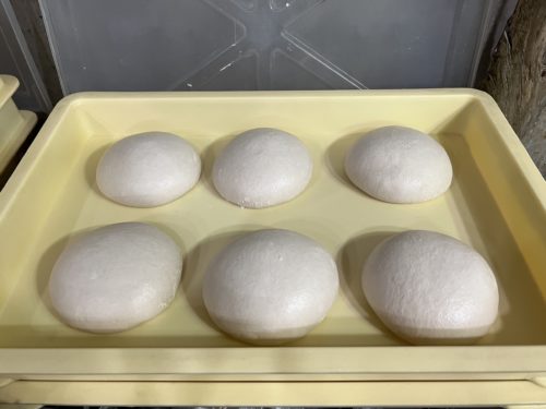 こちらは、前日に仕込んだ生地。発酵済みのもの。