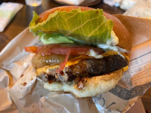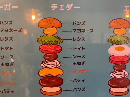 ノーマルな淡路島バーガーに、てりやきバーガー、肉汁飛び出すバーガーにアボカドチェダーバーガーなど、いろいろあって迷ってしまいますが、チェダーチーズバーガーがおすすめとのことでしたので、こちらを頼んでみました。