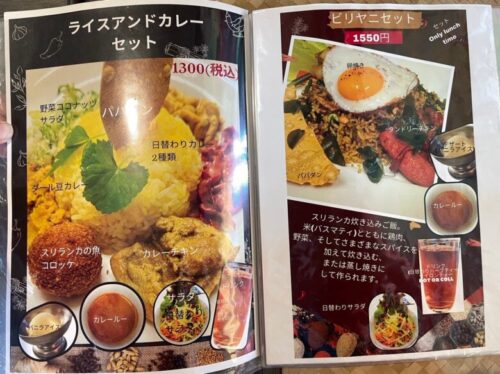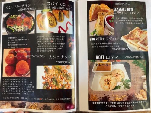 タンドリーチキンやカトレットと言われる魚介のコロッケ、小麦粉生地のロティなど、本場スリランカの料理もたくさんあり、ラッシーやハーブティー、スリランカビールなどのドリンクやアルコールもあります。
