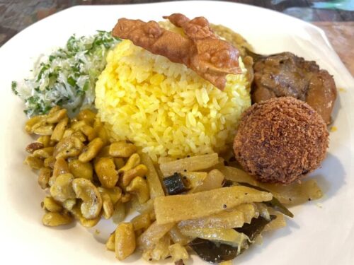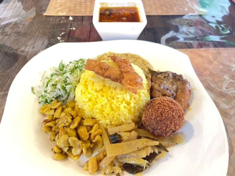 そして中央に盛られたライスを取り囲むように、カレーやチキン、ココナッツサラダにコロッケなどが盛られた彩りも豊かなプレート。