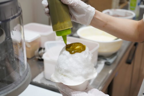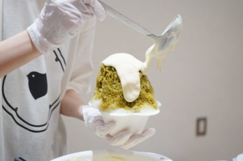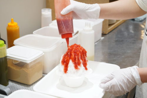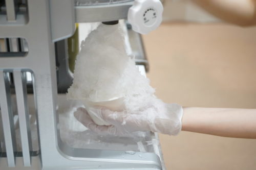 今回取材をさせていただいたAZUMIYAさんでは、氷を削る20~30分前に取り出し適温にしてから削るため氷本来の細かくふわふわとした食感を長く保てる工夫をされています。