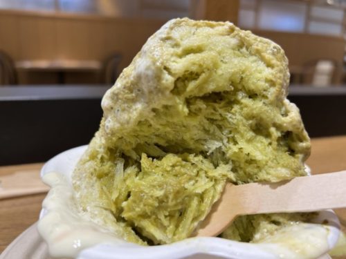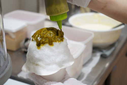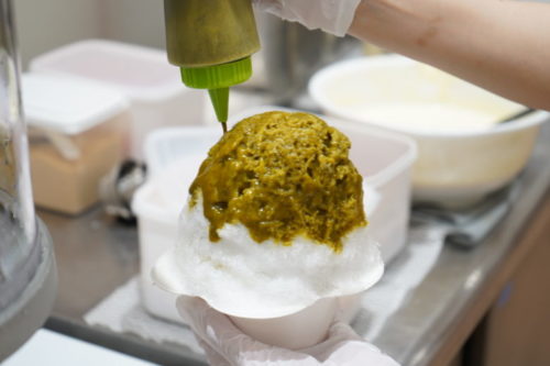 特別に中に入れていただきましたが、氷を削った後一度ピスタチオソースをかけ、さらに上から氷を削っていくんですが