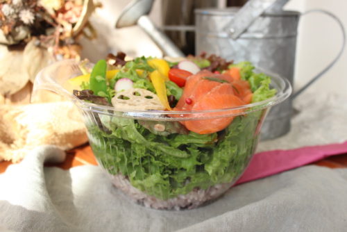 こちらのサラダボウルには、レタス、パプリカ、ミニトマト、蓮根など6種類前後の野菜を使っているそう。