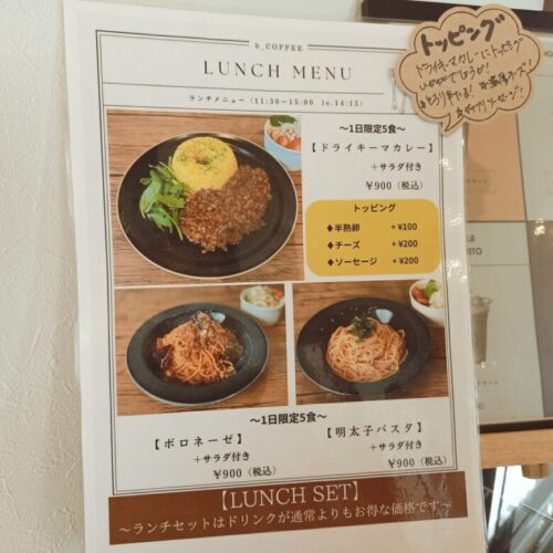 キーマカレーとボロネーゼ、明太子パスタはそれぞれ5食限定で、セットで飲み物もお安くなります。