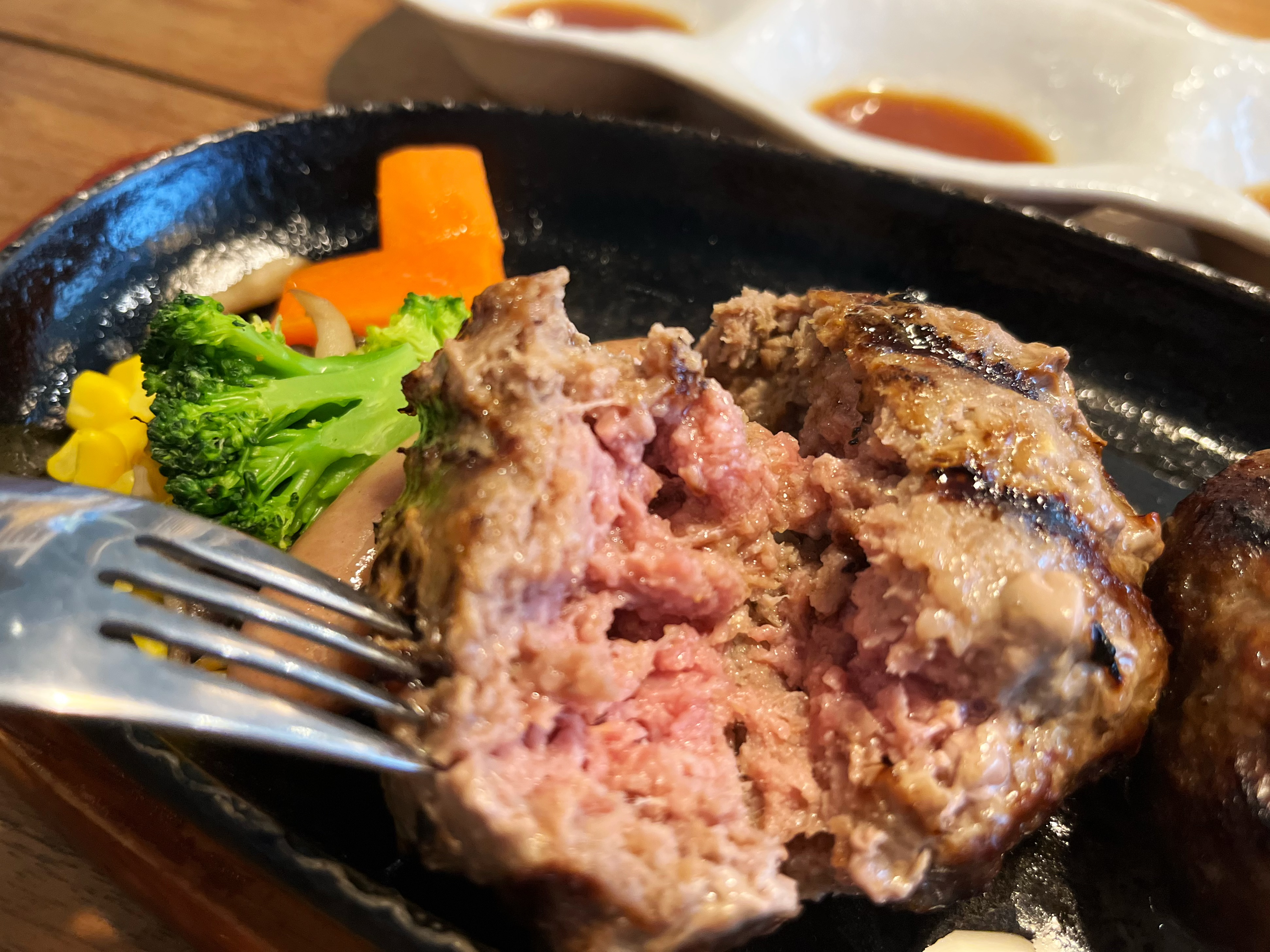 お次は牛肉のハンバーグ。こちらは馬肉のハンバーグとは対照的にお肉が細かくてとっても柔らかい。脂身部分が活きているからなのか、まろやかです。そして、味が濃い!お肉の味がしっかりします。