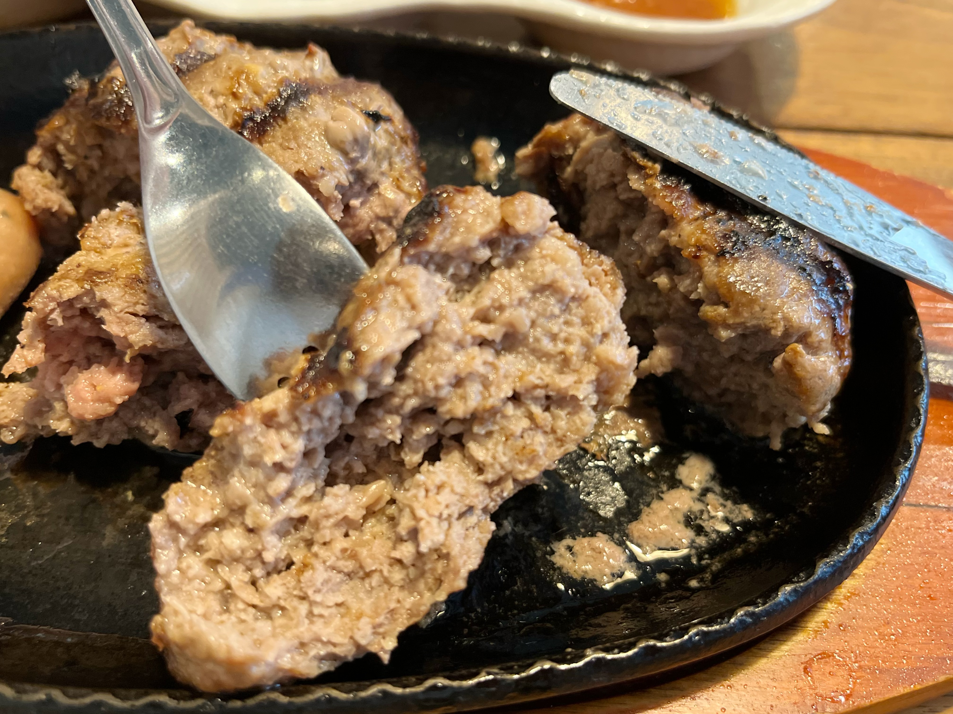 お肉が粗挽きでとても肉肉しいハンバーグ!ガツンとくる『お肉を食べてる』感。