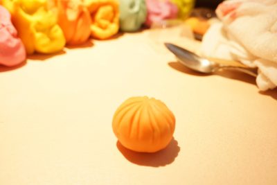 まずはオレンジ色の練りきりを平らにし、くぼみを作ります。