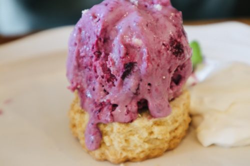 ミックスベリー、クリームチーズ、バニラアイスを使って手作りした自家製アイスクリームだそうです、美味しすぎるー。横に添えられたヨーグルトも付けて食べるもよし、