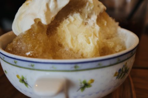 ヨーグルトクリームが乗った自家製レモンシロップのかかったかき氷。