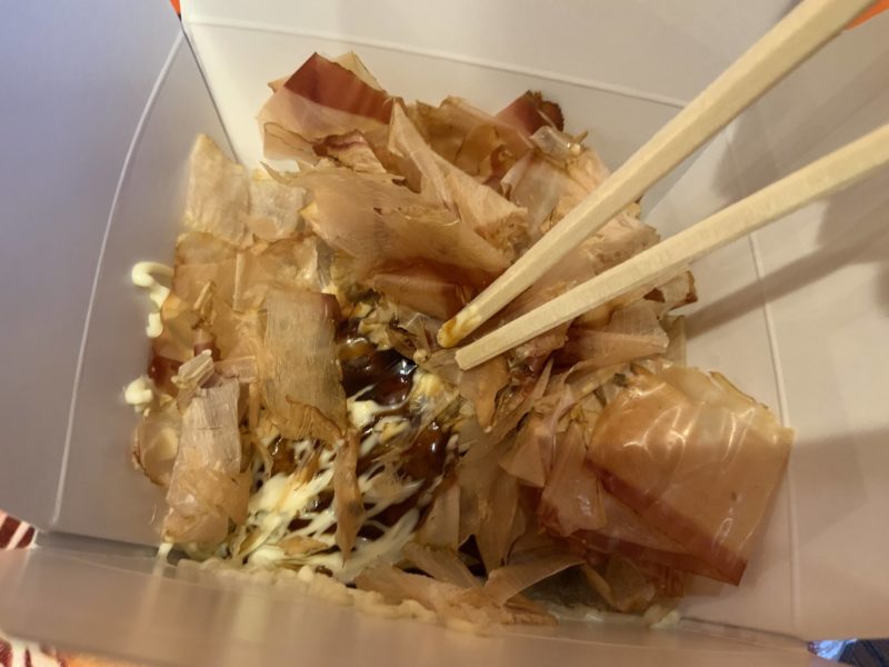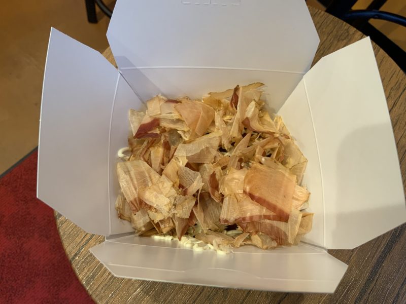 こんな感じで、箱に入れて渡してもらえるのですが、とにかく削り節がたっぷり乗っていて本体が見えません。