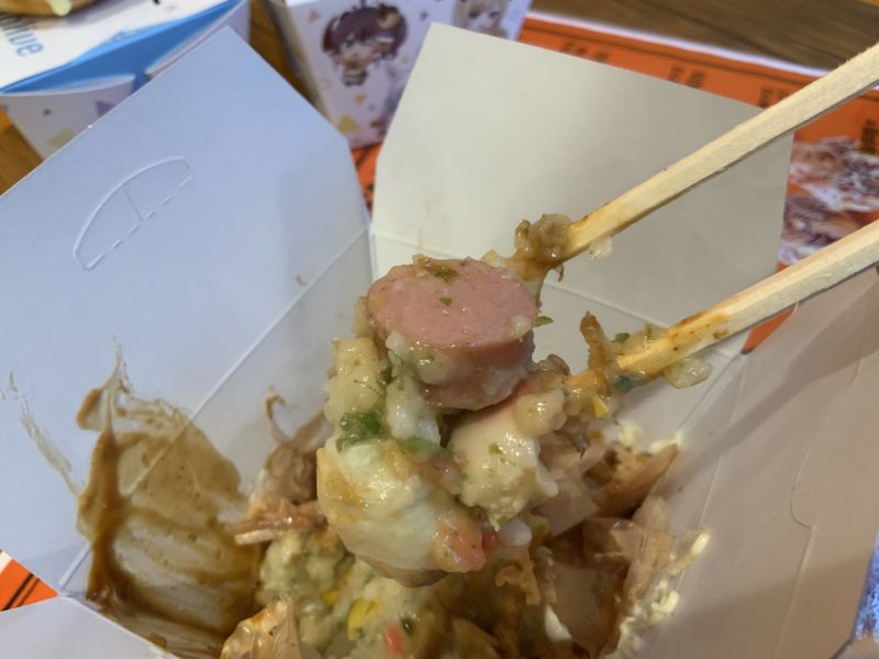 中にはうずらの卵やいか、あさり、しめじ、キャベツ、紅生姜などなど大量の具材が詰まっています。たこは入っていないので、決してたこ焼きでは無いと念押ししておきます。
