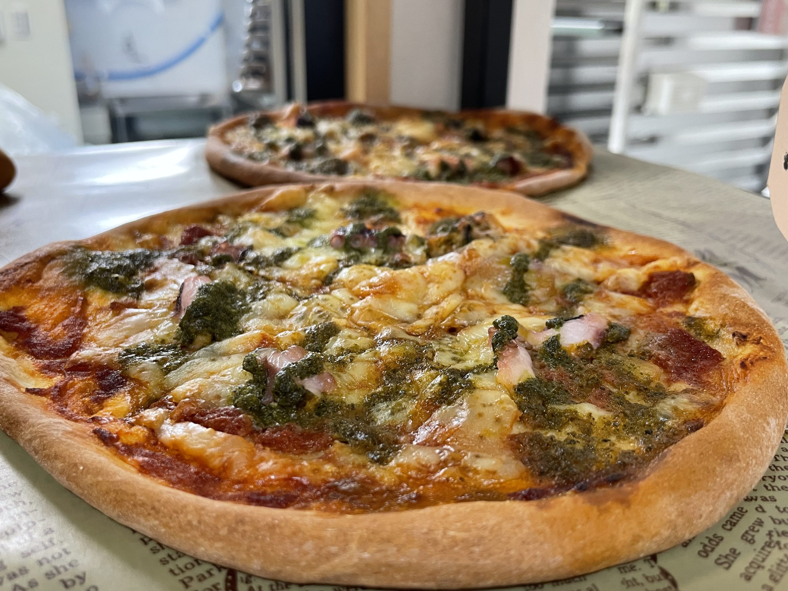 パン生地ピザ。ランチにいかがですか?バジルソースがたっぷり。