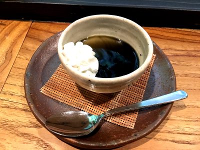最後のデザートはコーヒーゼリー?かと思ったら、竹炭コーヒーの黒蜜が掛けられた豆乳プリンでした。デザートも健康的ですね!