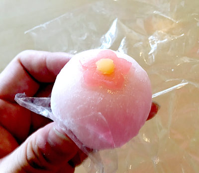 ピンクの色合いが美しい桜餅も絶品!中央の桜の模様も一つ一つ丁寧に手作りしてあり、職人の技が輝いています。