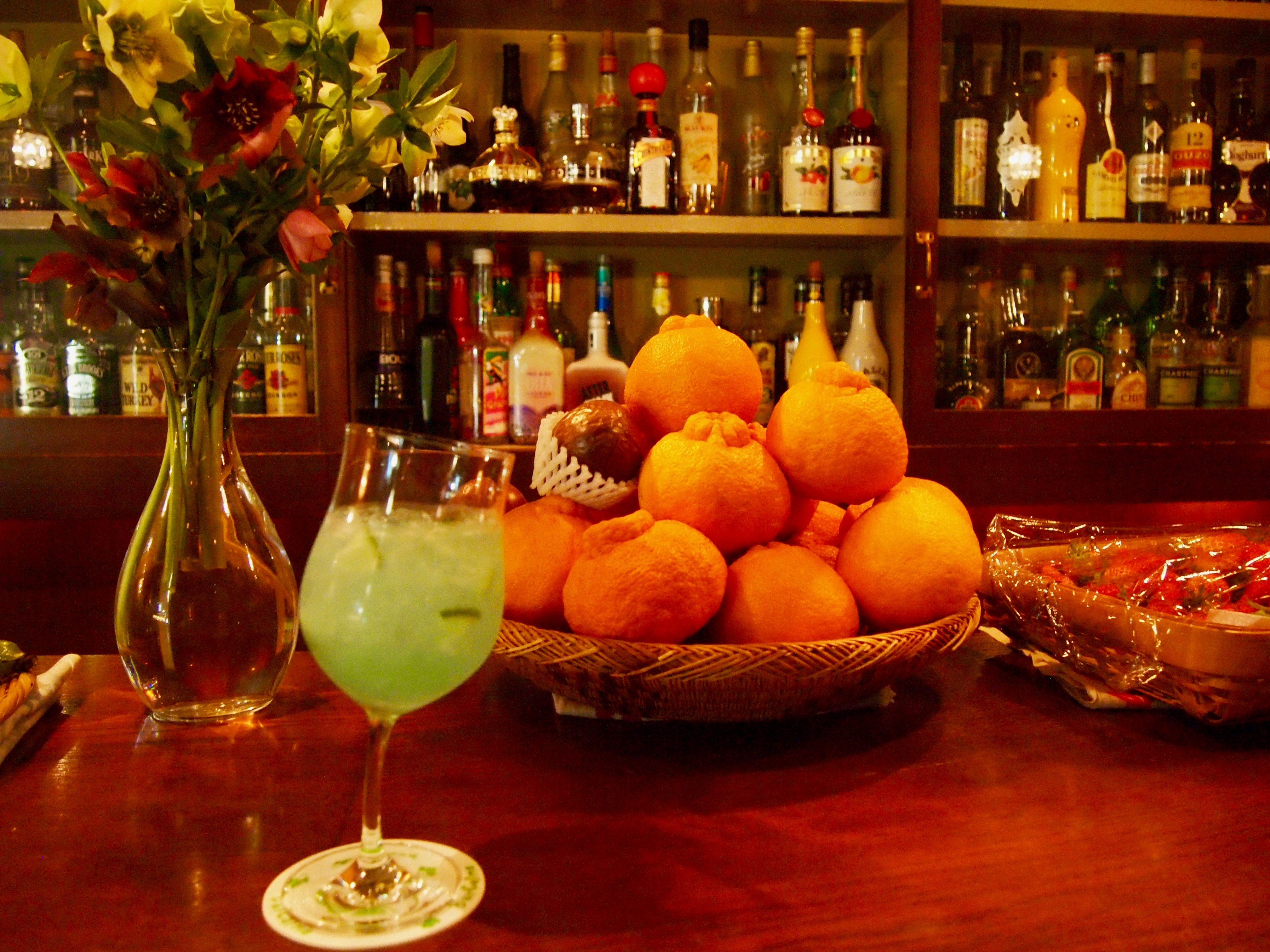 たった今目の前で生み出されたデコポンカクテルです。旬の物をお店で出されており、季節によってメニューが変わるため自分の好みを伝え、マスターにおすすめを聞くのが一番良いと思います。お値段もその時々で変わります。おおよそ1400円~。