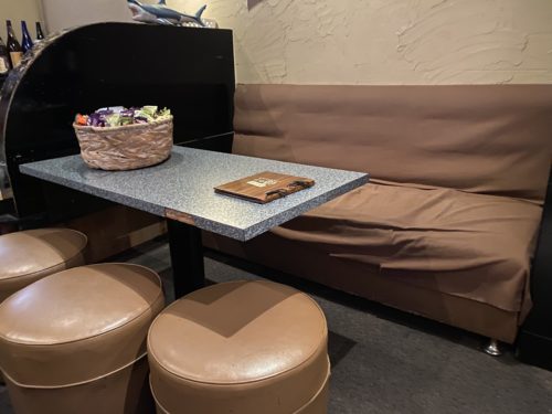 そして、ありました。畳とちゃぶ台の席です。御丁寧に座布団まで敷いてあります。こちらの席にはブラウン管テレビまで用意してありました。ピコピコハンマーやファミコンなど、懐かしいものが揃っています。