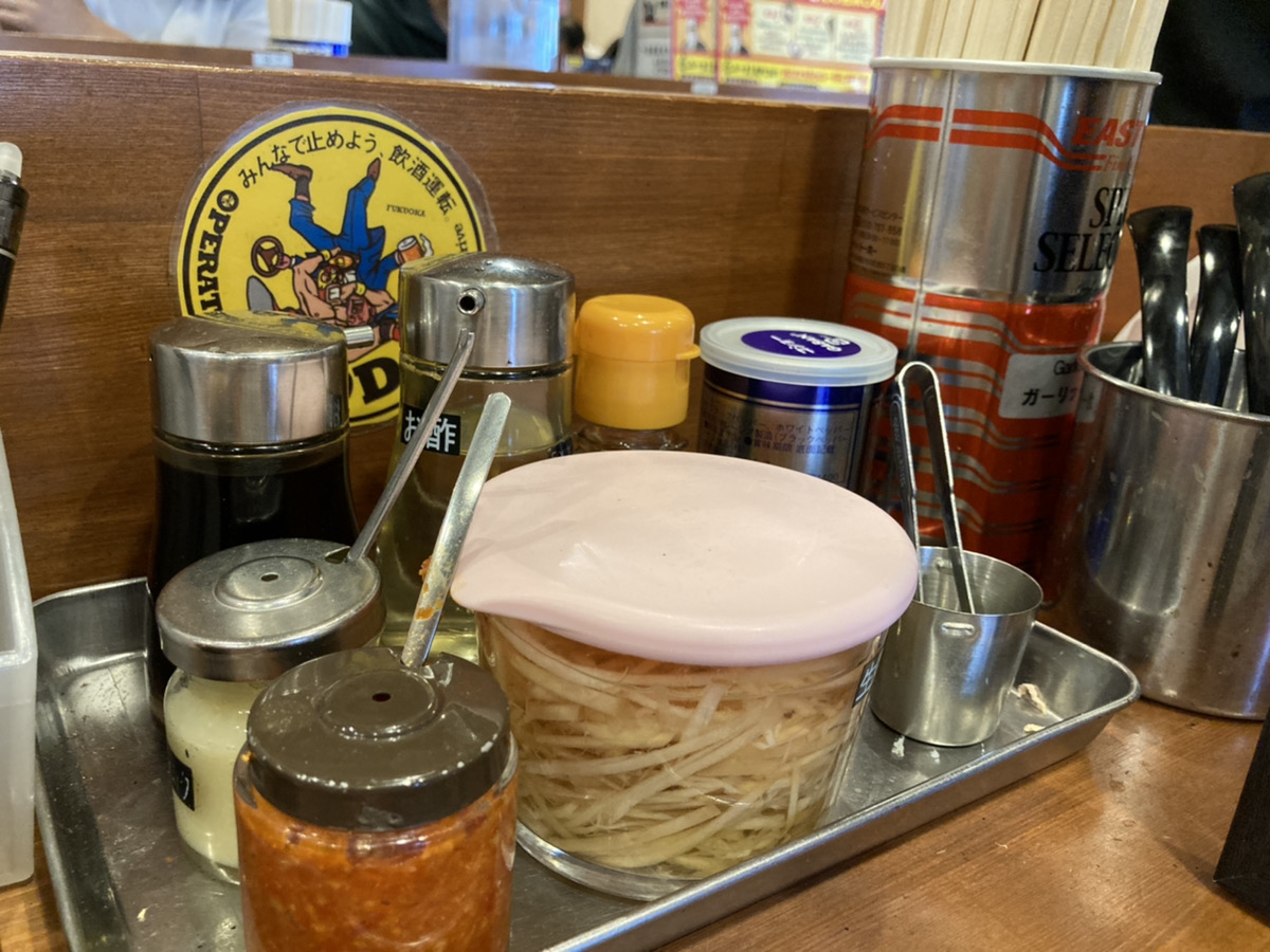 カウンターにある調味料で味変も自由自在。好みの味を見つけるものいいですね。