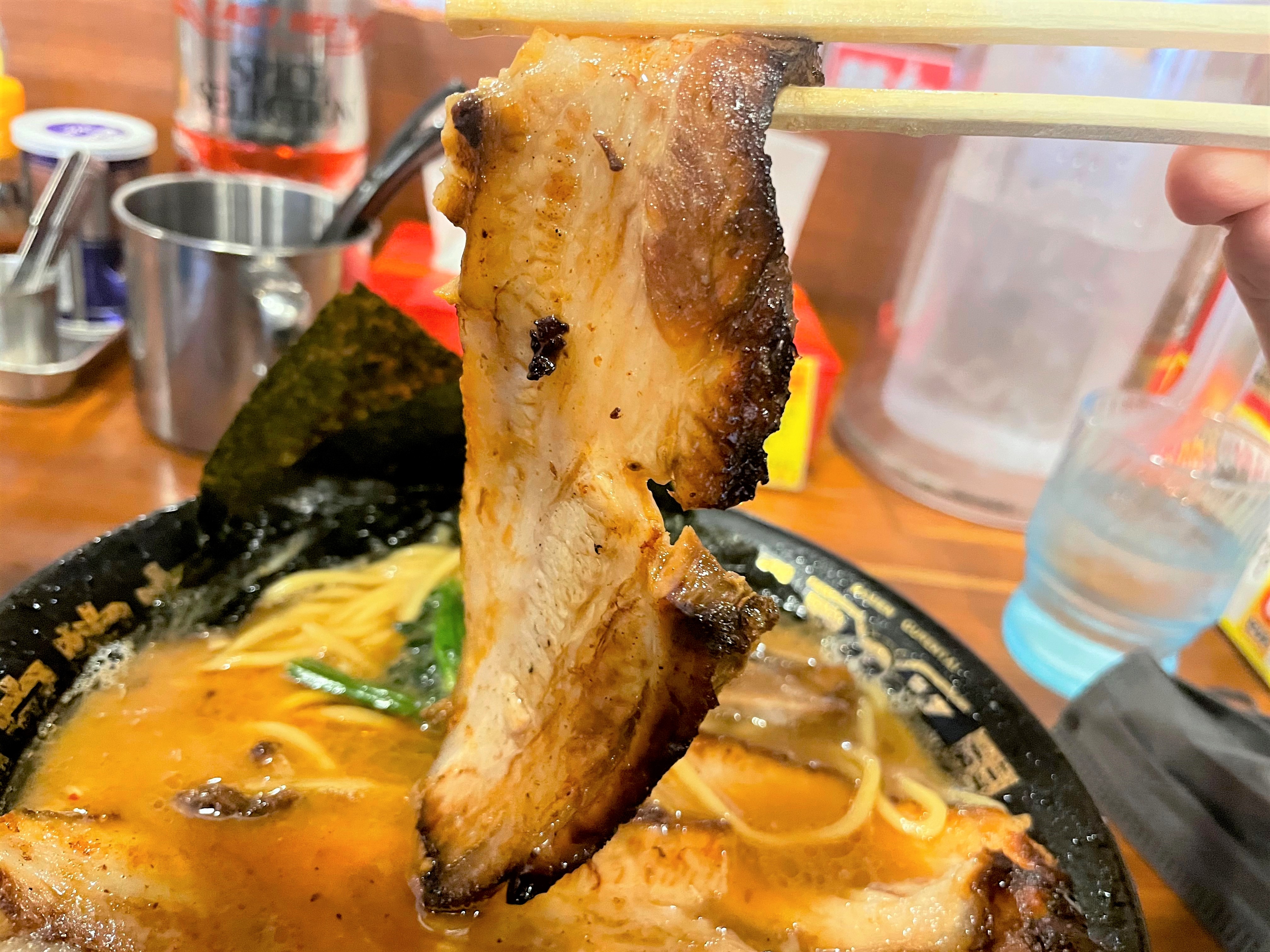 次にはみ出るチャーシューが破壊力ある見た目のぶっちぎりチャーシューメン。