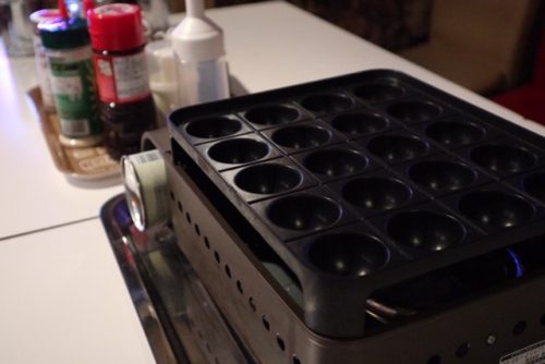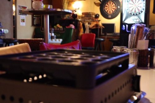 ダーツBarにガチの直火たこ焼き機。24席のお部屋にこのたこ焼き器が6台あります。