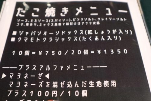お値段はこちら。あつあつのたこ焼きが10個750円。プラスアルファメニューもありますのでお尋ねください。