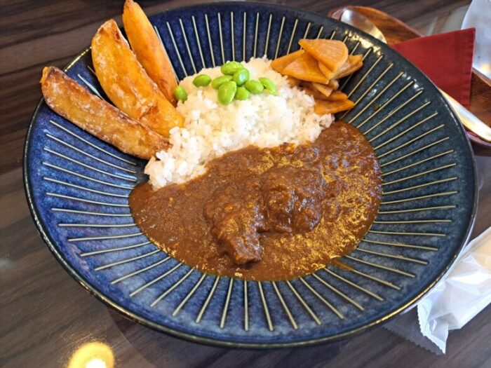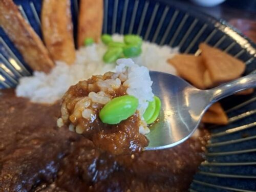 カレーにはにポテトと枝豆、お漬物がついています。