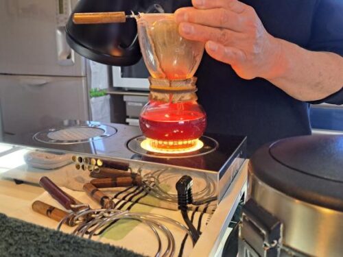 下からの光にコーヒーが照らされ、琥珀色~朱色になりとても綺麗です。