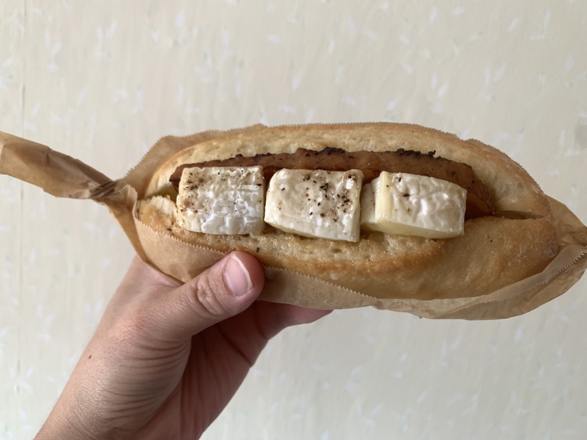 厚切りベーコンと角切りした大きなカマンベールが入った贅沢なサンドです。それでは早速頂きます。