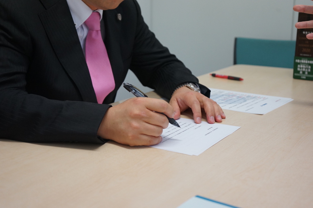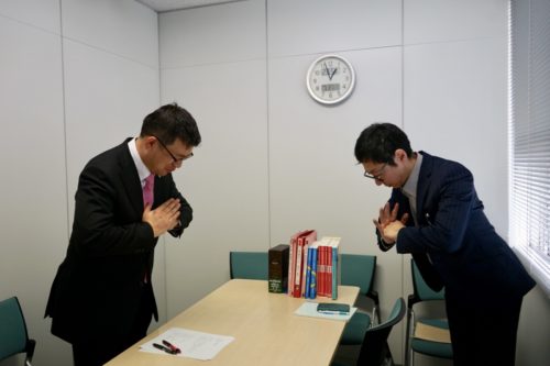 清水谷弁護士のご提案で、コロナ対策で握手を避けて中国拳法の挨拶のような終わり方。