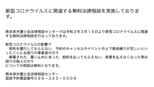 コロナ関連相談・熊本県南豪雨災害相談を無料で受け付けております