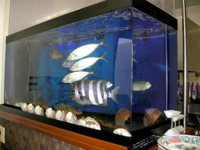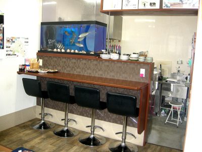 店主のこだわり!お店の席はカウンター4席と座敷に2卓8席で合計12席とコンパクトですが、そこに魚が泳ぎ回る水槽があります!