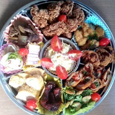 このボリューム満点のおかずセット!一品一品が手間暇掛けた手作りで、揚げ物だけに偏らない、煮物や酢の物もしっかり。このボリュームなのにバランスの良い食事が摂れますね!