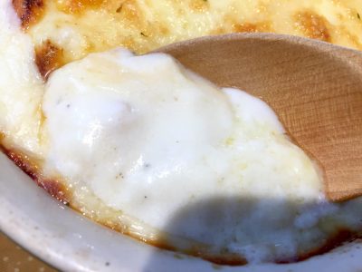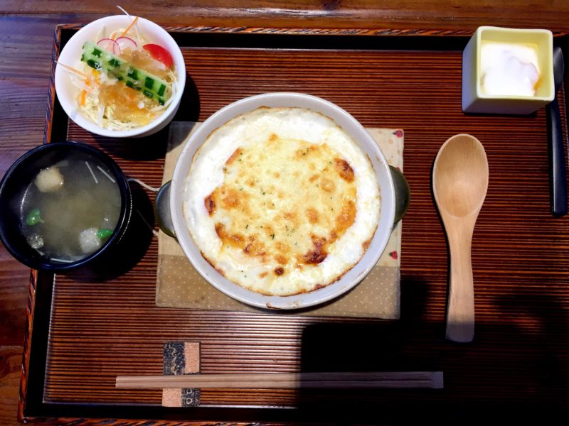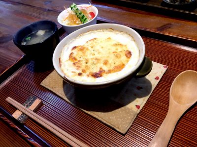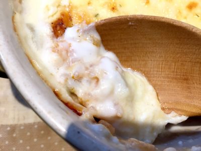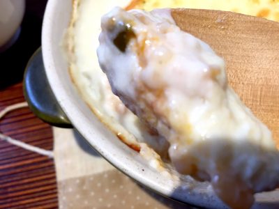 ドリアの焼き色と白がまぶしいです。さて、熱々を・・・すくって一口、すくって一口・・・