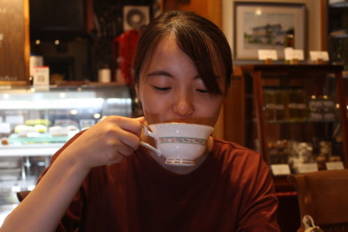 最後に紅茶を、ゆっくり飲んで、誇らしげな表情。贅沢なコース料理を堪能して、21歳なめこ、大人の階段をまた1つ登ったという達成感に満ちあふれております。