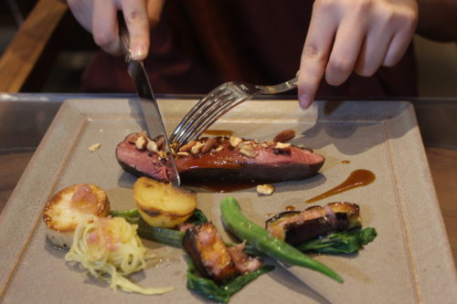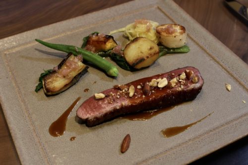 続いて、鴨胸肉のローストです。スパイスと蜂蜜のソースがかかっています。頂きます。