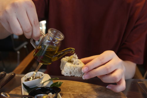 ハーブオイルをかけて頂きます。贅沢~!パンも自家製で焼いてるって凄いですよね。どちらもふわふわで優しい味。豚肉のリエットやタプナードも添られているので、味変も楽しめますよ。