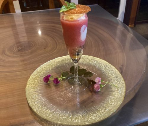 スペシャルデザートの桃のスープ仕立て。これもまた、美しい!見た目から楽しむことが出来ます。毎年提供されていますが、今年は、桃の香りと色を楽しめるように改良してあるそう。シェフの、向上心を常に忘れない熱い思いを感じることが出来ます。自家製の白桃、レモンのアイス、爽やかなミントのジュレテュイルが食べ進めるうちに混ざり合い、とても爽やか!さっぱりしていて、夏にぴったりのデザートです。