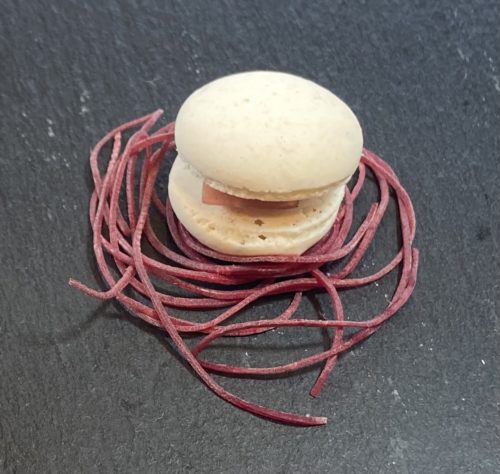 黒胡椒のマカロンは、中に生ハム、ドライイチジク、クリームチーズが入っており、全てがうまく融合し、美味!上に乗ったクリームチーズと愛称抜群のチーズサブレをパクリと食べ、前菜を完食。